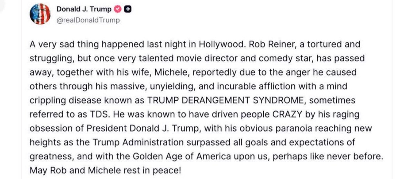 Trump’s derangement, the very thing he consistently accuses his perceived enemies of possessing, is so deeply rooted and apparent that it requires us not to waste our breath discussing it further. But what does require further discussion — what is absolutely necessary to raise over and over again — is the abject fucking hypocrisy in the wake of Reiner’s death.